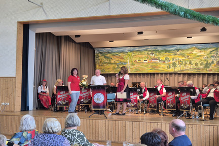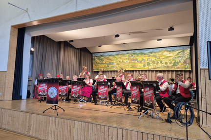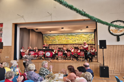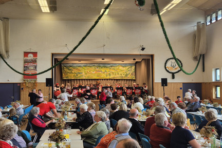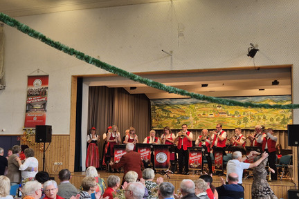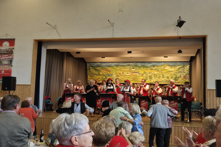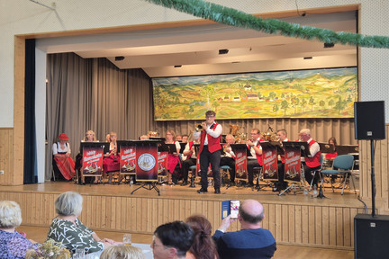 Bereits ab 12.30 Uhr füllte sich der Saal mit rund 150 Besucherinnen und Besuchern, die es sich bei Kaffee, Kuchen und kühlen Getränken gutgehen ließen. Um halb zwei hieß es dann: Bühne frei für uns! Mit Polka, Marsch und Walzer sorgten wir für den passenden Auftakt und spielten uns schnell in die Herzen des Publikums. Die Stimmung war von Beginn an herzlich, fröhlich und voller Begeisterung – so, wie man es sich als Musiker nur wünschen kann.